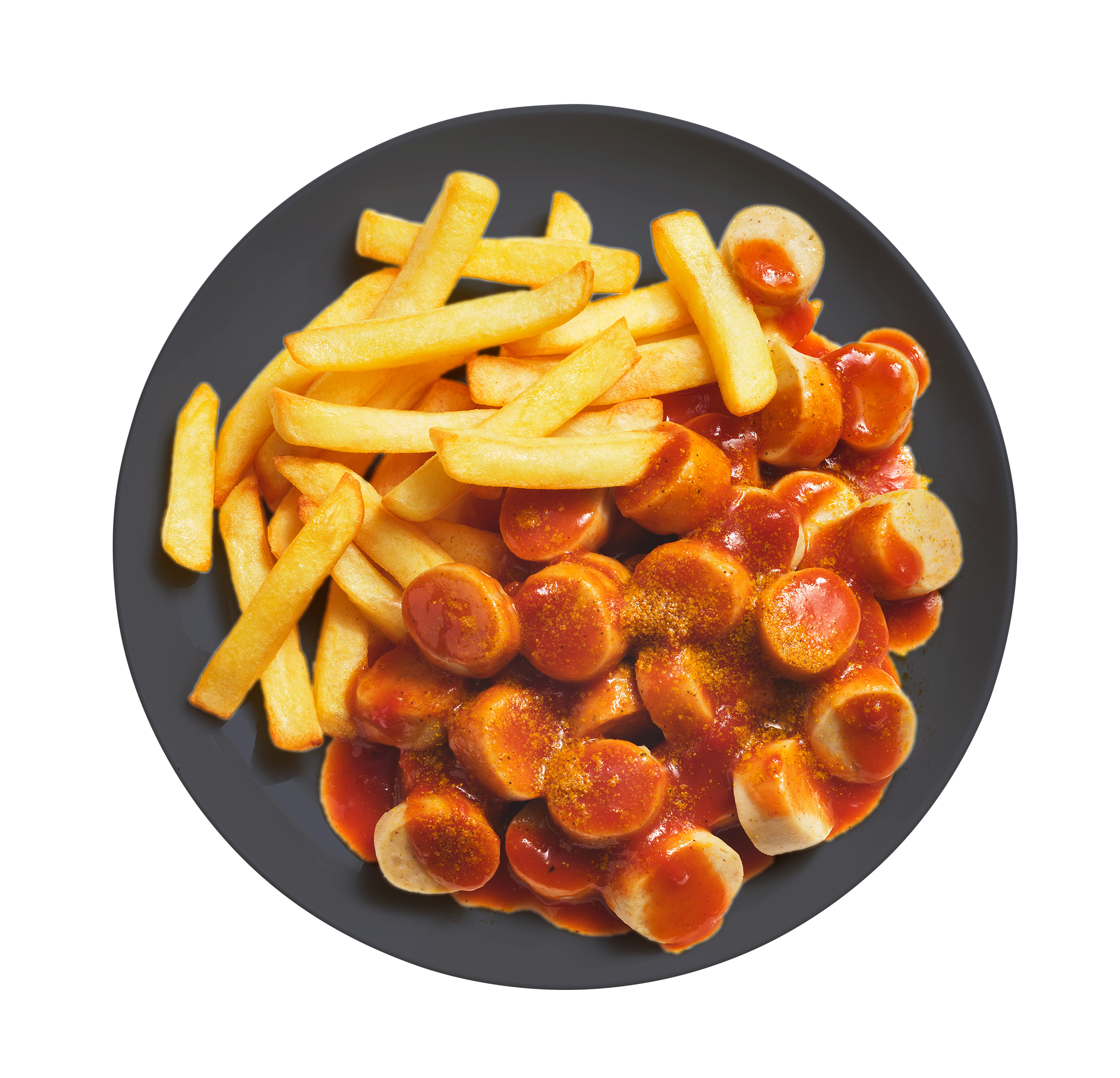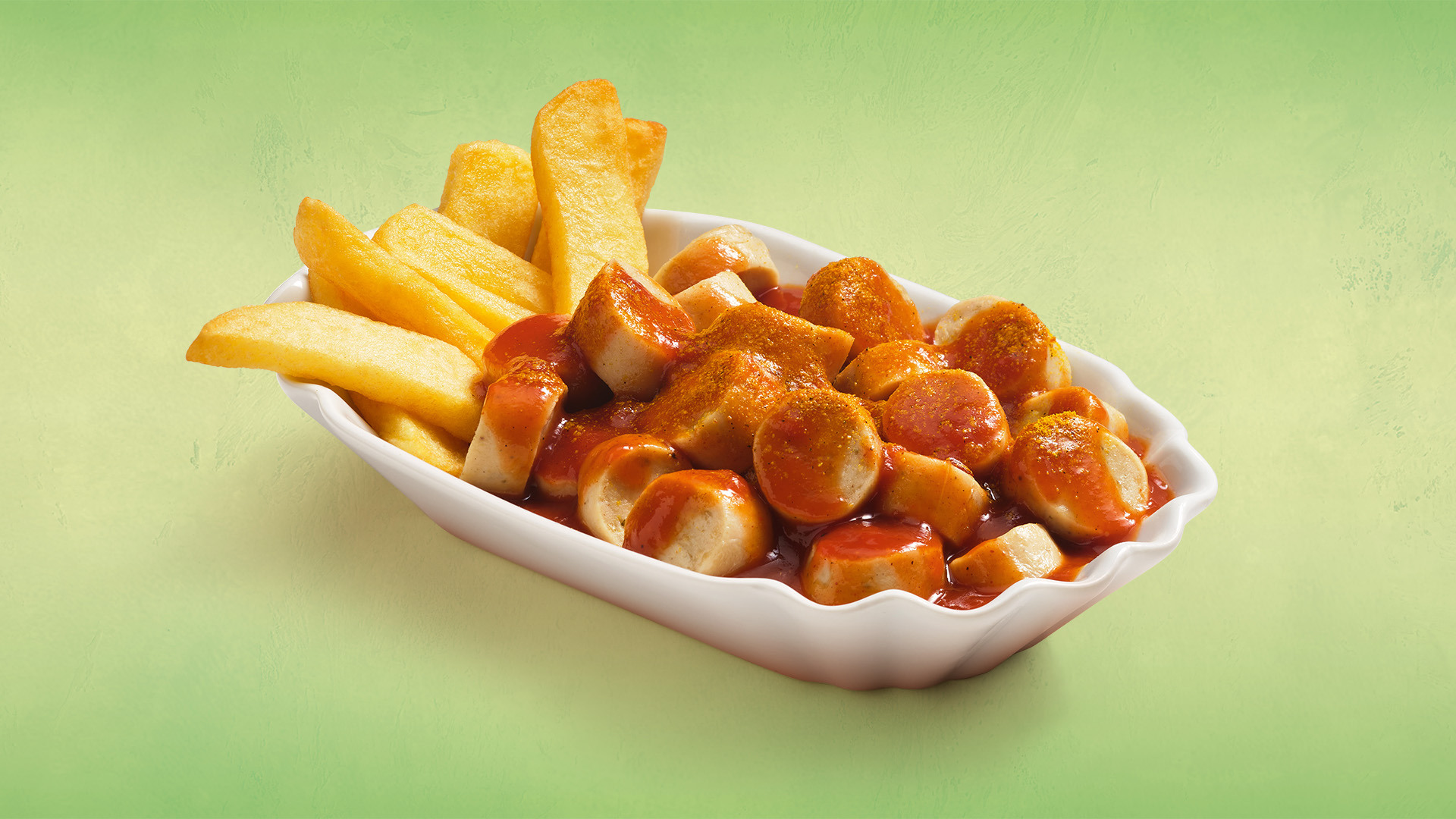500 g gefrorene Bratwurstscheiben in ca. 250 g handelsüblicher Currysauce in einem Gastronormbehälter bei 130 °C mit Dampf ohne Deckel ca. 25 Min. erhitzen.