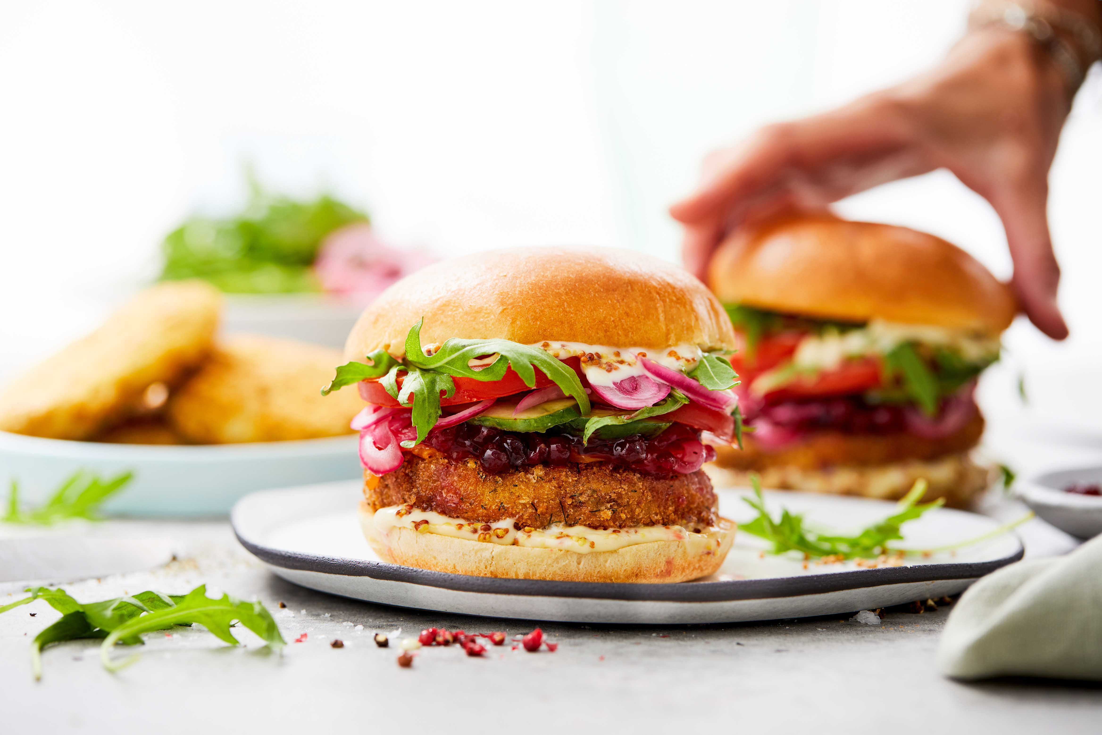 Ausreichend Pflanzenöl in einer beschichteten Pfanne erhitzen. Die Burger im aufgetauten Zustand zugeben und bei mittlerer Hitze von beiden Seiten insgesamt ca. 5-6 Minuten und bis zu einer Kerntemperatur von 73 °C gold-braun anbraten.