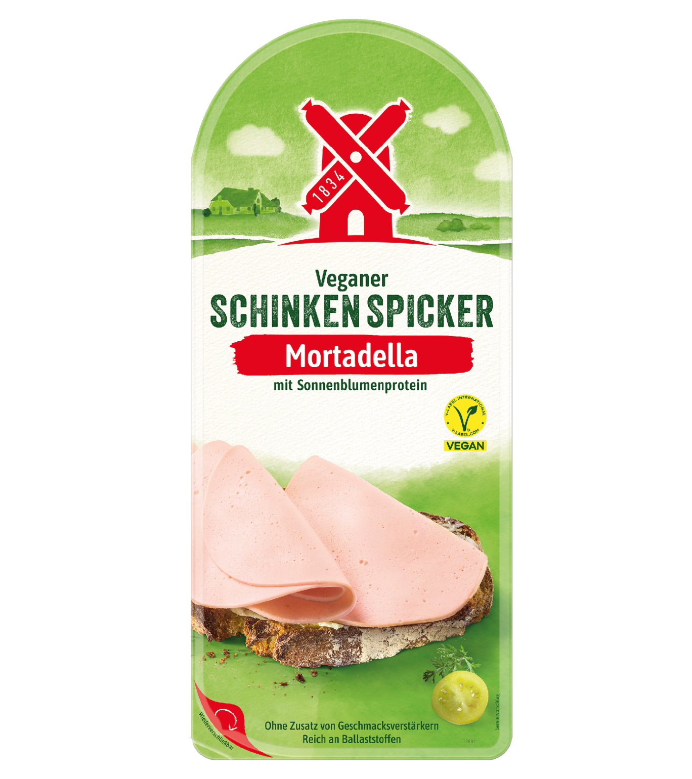 Der Vegane Schinken Spicker Mortadella sieht aus wie eine Schinkenwurst und schmeckt auch so: einfach lecker. Damit kommt Abwechslung auf jeden Tisch – egal ob zum Frühstück oder Abendbrot. Wie alle Produkte von der Rügenwalder Mühle wird der Vegane Schinken Spicker Mortadella ohne Zusatz von Geschmacksverstärkern hergestellt.