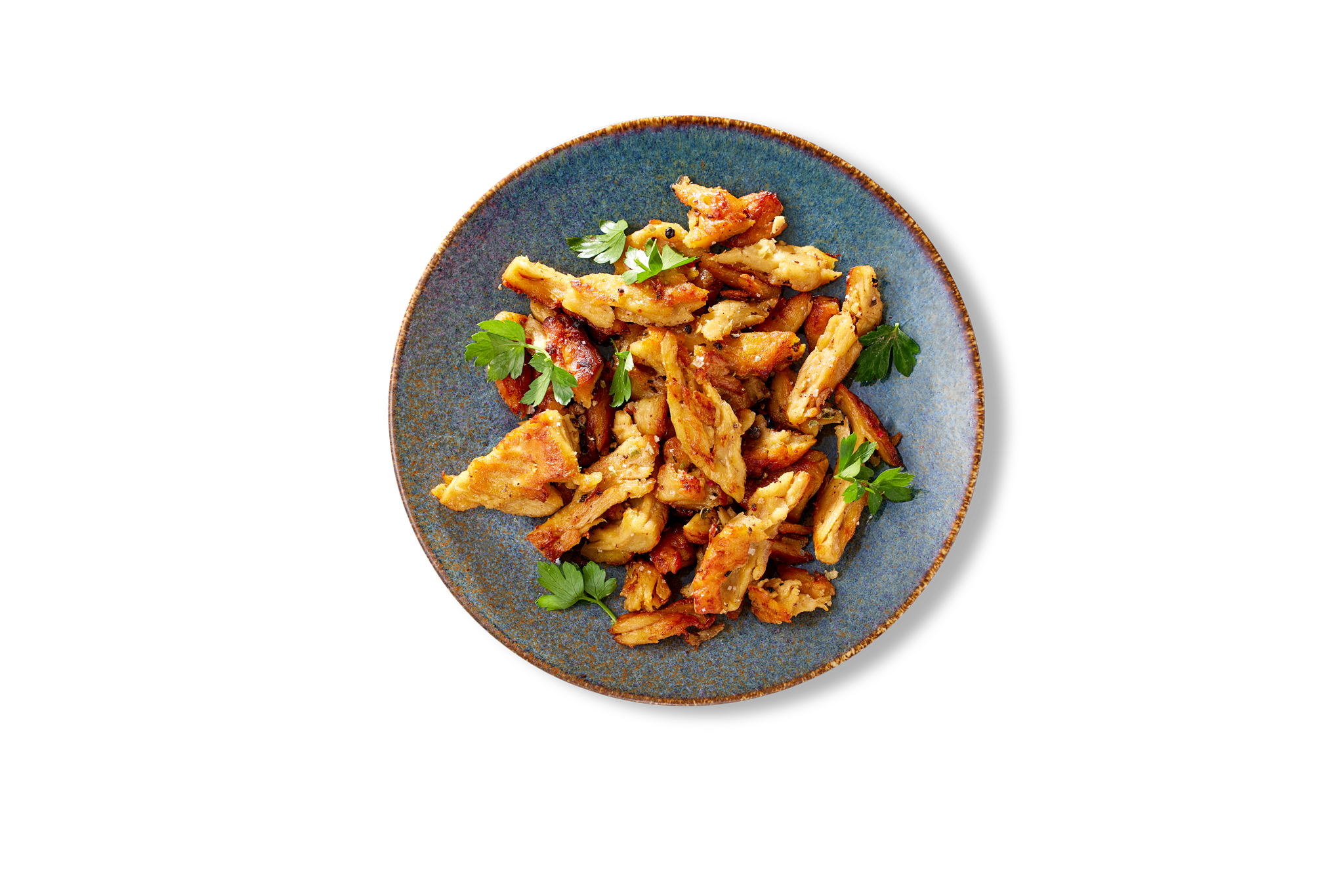 Saftiges veganes Chicken auf Basis von Weizen, Pilzen und Erbsen. Unser neues veganes Chicken ist ready to eat und eignet sich perfekt für warme wie kalte Gerichte.