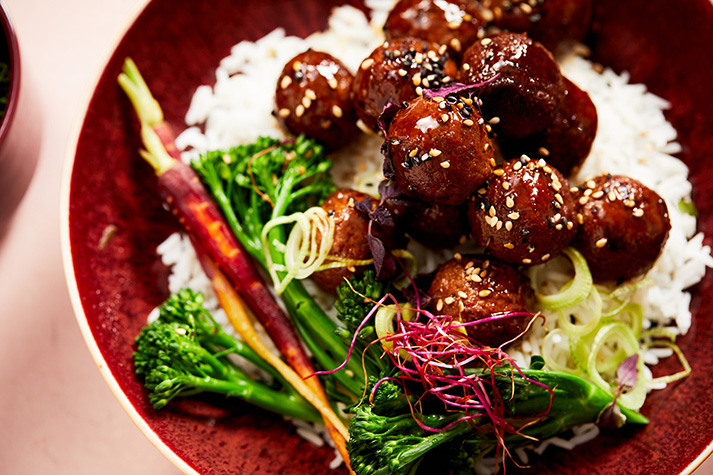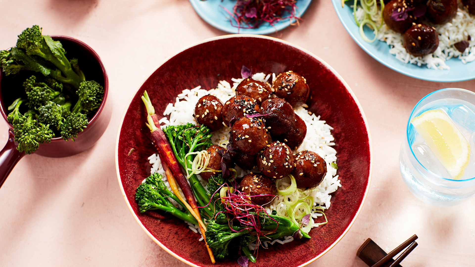 Zum Anrichten, den Reis in eine Schale geben und die endori veggie balls, Karotten und Brokkoli darauf verteilen.